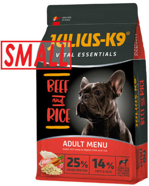 Julius K9 Beef and Rice Adult Small (marha, rizs) száraztáp - Felnőtt kistestű kutyák részére. A JULIUS-K9 bővítette kínálatát, hogy még színesebb skálán kínljon megbízható minőséget kedvenced számára. Vital essential tápcsaládja ideális választás felnőtt kutyád számára. 100%-ban természetes összetevők alkotják, rosttartalmáról pedig gabona helyett gyümölcs