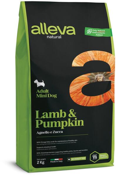 Alleva Natural természetes eledel alacsony gabona tartalommal, bárányhússal és sütőtökkel, kis felnőtt kutyák számára. a sütőtök, az inulin, a FOS, a MOS rostforrások, segítik a bélmikroflóra megfelelő működését monoprotein eledel - egyféle állati eredetű fehérjeforrást tartalmaz a nagy mennyiségű Omega-3 segít megőrizni a bőr egészségét a hozzáadott glükoza