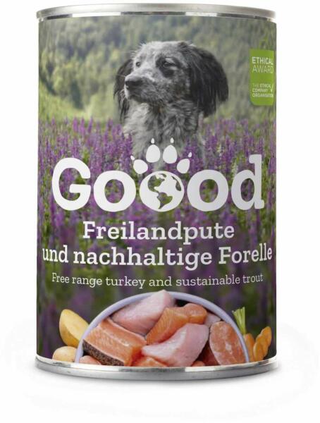 GOOOD Senior Freilandpute & Nachhaltige Forelle - Szabadon tartott pulyka & fenntartható pisztráng Könnyen emészthető, idős kutyáknak kifejlesztett receptúra. Könnyen emészthető nedves eledel szabadon tartott pulykával, fenntartható pisztránggal idős kutyáknak. A Goood kutyaeledelünk vajpuha pulykahúsát boldog, szabadon tartott pulykák szolgáltatják, akiket kizáróla