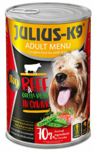 Julius-K 9 Konzerv marhával és zöldborsóval egy felnőtt kutyusoknak készült, teljes értékű nedveseledel. Magas nedvességtartalma hozzájárul a kutyusod napi folyadékbevitelének pótlásához. Hozzáadott kondroitin és glükozamin segít megőrizni a porcok és ízületek egészségét. Összetétel: h ús és állati eredetű származékok 40% (melyből marha 4%), gabonafélék, zö