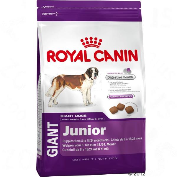 A ROYAL CANIN GIANT JUNIOR - megfelelő táp kutyák számára. Izomfejlődés és erősítés óriástestű kutyának 8 hónapos kortól 18-24 hónapos korig. A kondroitin elősegíti a porcok hidratációját, a glükozamin pedig segít helyreállítani a porc anyagcsere egyensúlyát. A szabadalmaztatott szerkezetű tápszemcse alapos rágásra ösztönzi a kutyát, ezáltal lassítva a táplá