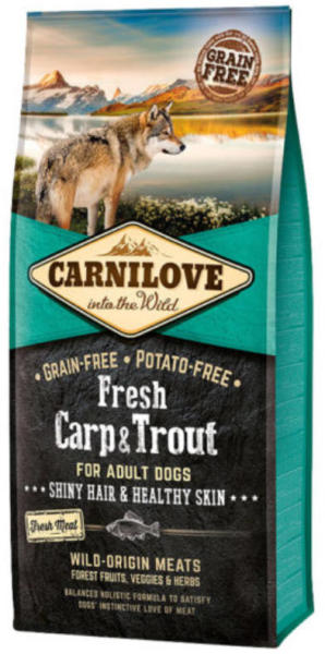 A Carnilove Fresh Adult Dog Ponty & Pisztráng egy gabona és burgonyamentes, ínycsiklandó prémium szárazeledel felnőtt kutyák számára. Az eledel friss hús, zöldségek, piros bogyós gyümölcsök, zöldségek és gyógynövények egészséges kombinációja. A ponty rövidebb izomrostokkal rendelkezik, igazán könnyen emészthető. A pisztráng és ponty omega-3 zsírsavak termész