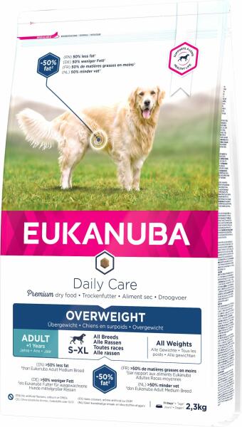 Eukanuba Overweight teljes értékű és kiegyensúlyozott eledel elhízásra hajlamos vagy ivartalanított felnőtt kutyák számára. A túlsúlyosság megnöveli a szívbetegség, ízületi problémák és cukorbetegség kockázatát. A jó állapot fenntartása nagyon fontos a kutya általános jó közérzetének fenntartásához, és a rendszeres mozgáson felül ez a minőségi eledel szint