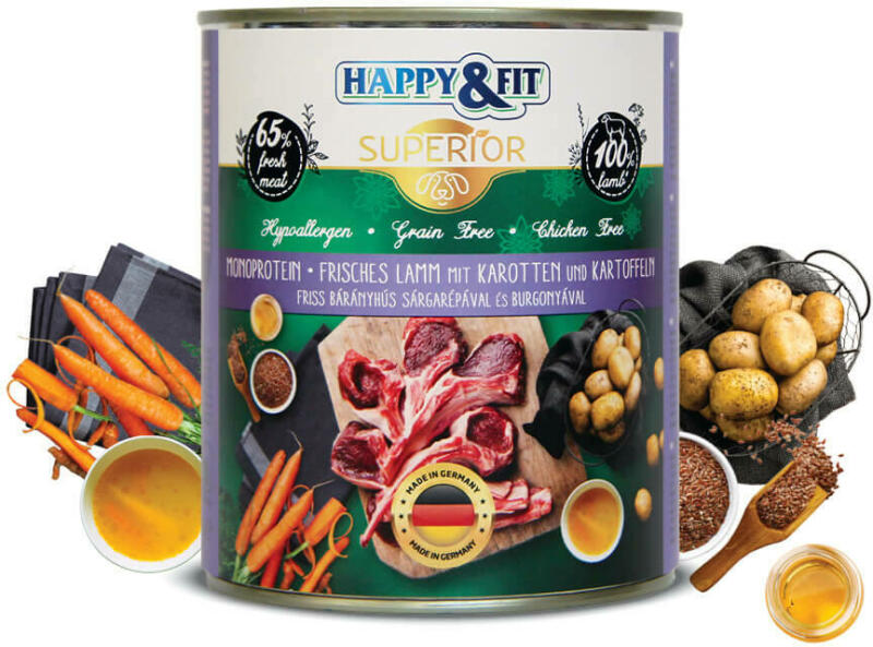 A Happy&Fit Superior 100% Monoprotein - Friss bárányhús sárgarépával és burgonyával készült termékünk a gabona- és baromfifélék teljes mellőzésével, természetes összetevők felhasználásával készül. Ez az étel kiemelkedik a 65%-os hústartalmával. Mi teszi különlegessé a Happy&Fit Superior 100% Monoprotein - Friss bárányhús, sárgarépa és burgonya ízesít