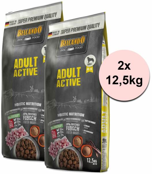 BELCANDO Adult Active teljes értékű szuper prémium eledel fokozott aktivitású felnőtt kutyák részére, a fehérje és zsír tartalom megfelel az aktív kutyák energia szükségleteinek - 25 kg. A kutyatáp 75%-a állati eredetű fehérjéből (55% csirkehús, 15% hal, 5% zselatin) és 25% növényi fehérjéből készült garantált an gabona-, szárazföldi állatok húsából származ
