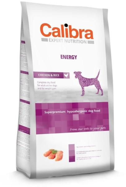 Calibra Expert Nutrition Energy hipoallergén, teljes értékű, szuper prémium minőségű szárazeledel a fokozott fizikai aktivitású kutyák számára, csirkehússal és rizzsel. az EXPERT NUTRITION termékek nem tartalmaznak búzát, szóját, kukoricát, mesterséges színezékeket sem tartósítószereket, genetikailag módosított organizmusoktól mentesek akár 90% állati eredetű feh