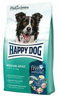 Happy Dog Fit & Vital Adult Medium kutyatáp egy kiegyensúlyozott, teljes értékű szárazeledel 11 és 25 kg közötti testsúlyú kutyák számára. Ínycsiklandozóan finom száraztáp, melyet a szárnyas, bárány és lazac ízkombinációja tesz igazán ellenállhatatlanná. 5 különböző fehérjeforrást tartalmaz: baromfit, bárányt, lazacot, tengeri halat és tojást. Mindezek hoz