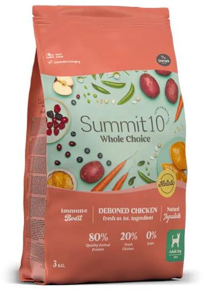 Summit 10 Whole Choice Adult Mini Chicken Teljesértékű, gabonamentes száraz kutyatáp friss csirkével, kifejezetten kistestű kutyáknak A kistestű fajták számára szükséges ideális energiamennyiséggel. Ez a recept emellett jól emészthető szénhidrátokat és különféle gyümölcsöket és zöldségeket, például borsót, sárgarépát, almát és bogyós gyümölcsöket tartalma