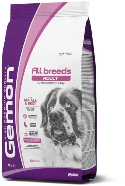 Gemon Dog Adult sertés-rizs teljes értékű állateledel minden fajtájú és méretű, felnőtt kutyáknak. A készítményt olyan kiváló minőségű összetevők jellemzik, mint a sertéshús, amely az alapvető tápanyagok forrása, és a rizs, amely a szénhidrátok forrása. A receptúra az extrudálási eljárásnak köszönhetően rendkívül könnyen emészthető. A pro és prebiotikus