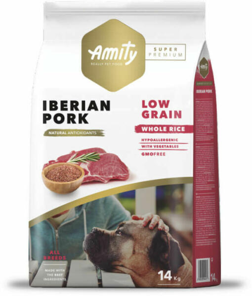 Amity Adult Hypoallergenic Iberian Pork 14kg Szuperprémium hipoallergén száraztáp ibériai sertéssel és barna rizzsel minden testméretű felnőtt érzékeny gyomrú, vagy ételintoleranciával küzdő kutya számára. Amity Adult Hypoallergenic Iberian Pork ( ibériai sertéssel és barna rizzsel ) száraztáp felnőttkutyák részére ) Az Amity Hypoallergén termékek speciális formuláj