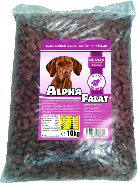 ALPHA FALAT SONKÁS 10KG Teljes értékű száraz kutyaeledel normál aktivitású felnőtt kutyák részére sonkás ízesítéssel. Az Alpha Falat etetésével a garantált minőségű nyersanyagok alkalmazásának köszönhetően kutyája egy kiválóan emészthető kellemes ízű szívesen fogyasztott táplálékhoz jut. Szárazanyag min. 93% nyersfehérje min. 16% nyerszsír min. 6% nyersrost