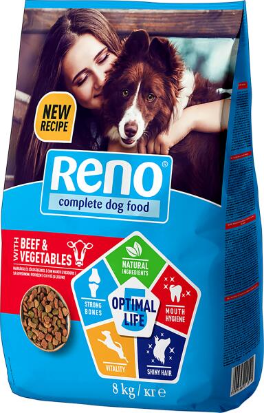 Reno Opti Life száraz kutyaeledel marhával Összetétel: Gabonafélék*, hús és állati származékok (15%, melyből 4% marha), növényi eredetű származékok, olajok és zsírok, ásványi anyagok, zöldségek* (0,45% szárított borsó**). *Természetes összetevők és teljes kiőrlésű gabonafélék. **4% borsónak felel meg. Analitikai összetevők: Nyersfehérje 21,0% Zsírtartalom 11