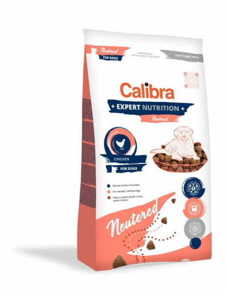 Calibra Expert Nutrition hipoallergén, teljes értékű, szuper prémium szárazeledel felnőtt és idősebb ivartalanított kutyák számára, csirkehússal és rizzsel. az EXPERT NUTRITION termékek nem tartalmaznak búzát, szóját, kukoricát, mesterséges színezékeket sem tartósítószereket, genetikailag módosított organizmusoktól mentesek akár 85 % állati eredetű fehérjét tarta