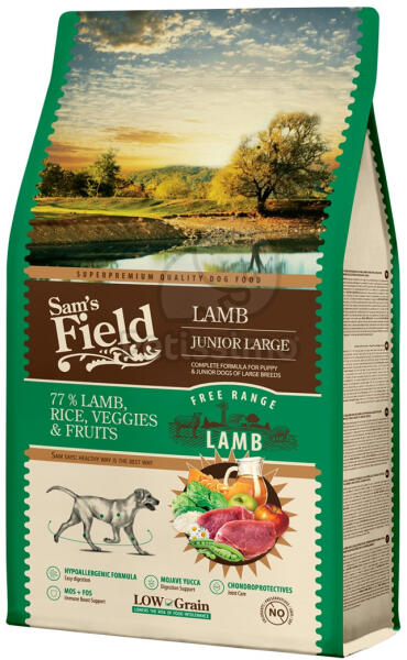 A Sam's Field Junior Low Grain Lamb - Large egy teljes értékű, bárányhúsos száraztáp nagytestű fiatal kutyák számára. Kifejezetten nagy testméretű fiatal kutyák igényei szerint kifejlesztett eledel. Isteni bárányos-rizses ízvilág. - A bárányhús különösen jó minőségű fehérjékben gazdag hús, ami szinte az összes lényeges aminosavat tartalmazza. B-vitaminban és ás