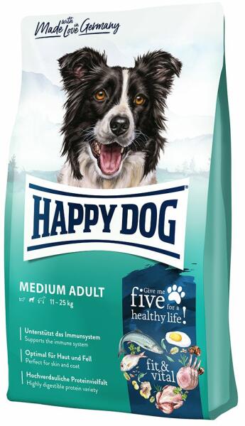 5 értékes fehérjeforrással = tökéletesen kiegyensúlyozott Gluténmentes összetevők Mérsékelt zsírtartalom Eredeti új-zélandi kagyló 24/13 fehérje-/zsírtartalom Immunrendszer támogató összetétel, a maximálisan kiegyensúlyozott étrendért a közepes testméretű kutyáknak kifejlesztve. A Happy Dog Medium Adult 5 kiváló minőségű, könnyen emészthető fehérje-összetev