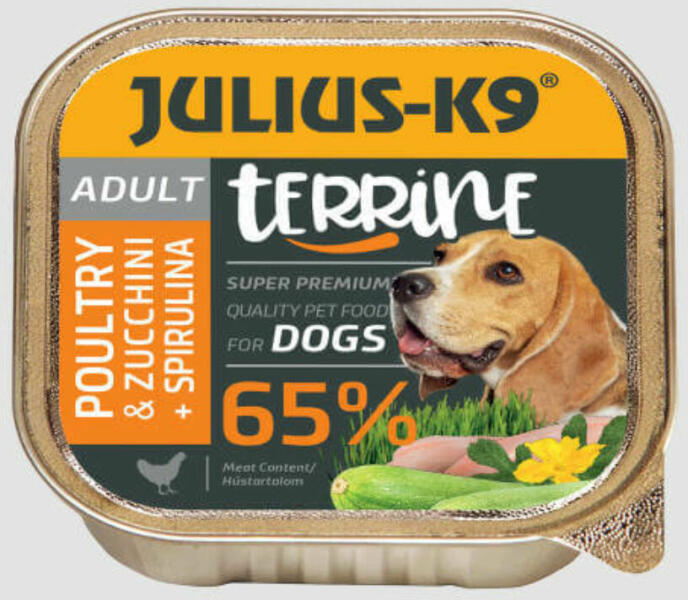 Julius-K9 Dog Terrine Adult Poultry&Zucchini, spirulina nedveseledel cukkini hozzáadásával készült. Ez a kiváló minőségű, nedves kutyatáp kifejezetten az felnőtt kutyák számára ajánlott, akiknek kiemelten fontos az ízletes és tápláló étel. Miért érdemes a Julius-K9 Dog Terrine Adult Poultry&Zucchini, spirulina nedvestápot választani? A szárnyashús remek fehérje