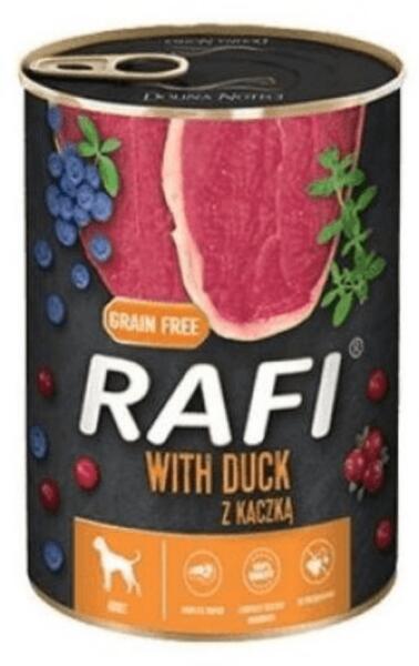 Dolina Noteci Rafi kacsával 800g - Leírás Teljes értékű nedves eledel minden fajta felnőtt kutyának kacsával. Ez a Rafi nedves eledel a kacsából származó hús és állati eredetű nyersanyagok felhasználásának köszönhetően teljes értékű fehérjeforrás, amely tartalmazza az összes esszenciális aminosavat. A kacsaeledel megfelelő arányban tartalmaz szelént, rezet és vasa