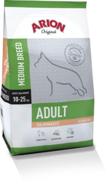 Arion Original Adult Medium Salmon&Rice gluténmentes, teljesértékű szárazeledel kifejlett kutyák számára. Összetétele pozitívan befolyásolja a bőr és szőrzet alakulását, ezzel hozzájárul az életminőség jelentős javulásához, különösen az érzékeny és száraz bőrű, allergiás reakciókra hajlamos kutyák esetében. Az Arion Original prémium minőségű, gluténme