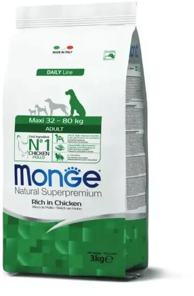 Monge Dog Daily Line Maxi AdultTeljes értékű szárazeledel nagytestű (32-80 kg) felnőtt kutyák számára csirkével. A kiváló minőségű alapanyagoknak és az olasz kutatómunkának köszönhetően egészséges táplálkozást biztosít kutyájának. A termék fő összetevője a csirke, amely könnyen emészthető és a friss hús hozzáadásának köszönhetően nagyon ízletes. A recep