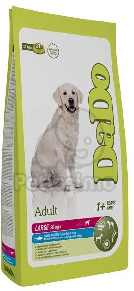 DADO ADULT LARGE BREED OCEAN FISH & RICE 12kg A DaDo Adult Large Breed Ocean Fish and Rice egy hipoallergén, tengeri hal és rizs alapanyagú, teljes értékű és kiegyensúlyozott kutyatáp, ideális a nagytestű fajták (+26kg) felnőtt egyedei számára normál fizikai aktivitás mellett. Kizárólag halat tartalmaz állati fehérjeforrásként, antiallergén formulája(glutén mentes) mi