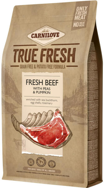 Carnilove True FreshMarha, borsó és sütőtök Friss marhahúsból készült teljes értékű száraz kutyatáp, gabona- és burgonyamentes receptúrával, minden testméretű, felnőtt kutya számára A termék legfőbb jellemzői: Friss marhahús borsóval és sütőtökkel 60% friss hús - közvetlenül és kizárólag friss húsból feldolgozva (1 kg táp 600 g friss marhahúst tartalmaz) A