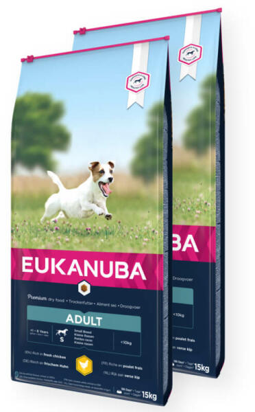 EUKANUBA ADULT SMALL BREED 100 %-ban teljes értékű és kiegyensúlyozott beltartalmi értékű táp kistestű felnőtt kutyák részére. Összetétel: Szárított Csirke és pulykahús ( 32% ), búza , kukorica, állati zsiradék, cirok, rizs , árpa , hidrolizált állati fehérjék, szárított cukorrépapép ( 3,1%), szárított egész tojás, kálium-klorid, halolaj , lenmag, nátrium-klor