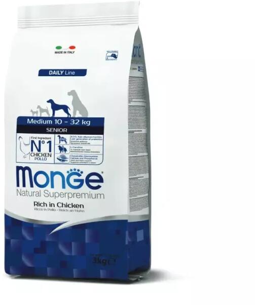Monge Dog Daily Line Medium SeniorTeljes értékű szárazeledel közepes méretű (10-32 kg) idős kutyák számára csirkével. A kiváló minőségű alapanyagoknak és az olasz kutatómunkának köszönhetően egészséges táplálkozást biztosít kutyájának. A termék fő összetevője a csirke, amely könnyen emészthető és a friss hús hozzáadásának köszönhetően nagyon ízletes.