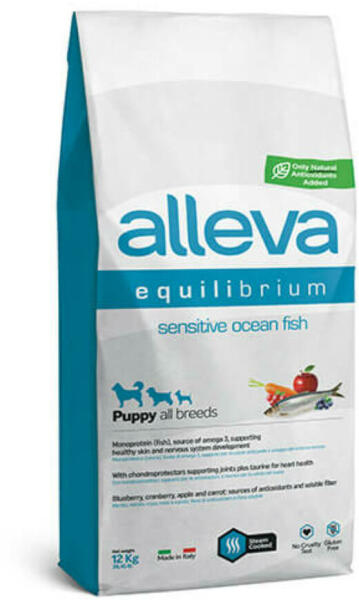 Alleva Equilibrium gabonamentes eledel tengeri hallal, valamennyi érzékeny emészőrendszerű kölyökkutya számára megfelelő. monoprotein eledel - egyféle állati eredetű fehérjeforrást tartalmaz a nagy mennyiségű Omega-3 segít megőrizni a bőr egészségét hozzáadott glükozamin és kondroitin az ízületek megfelelő működése érdekében Az eledel finoman párolt, így megőrz