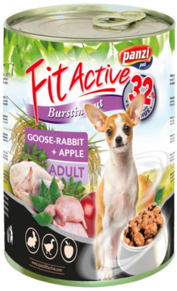A Panzi FitActive Adult Dog konzerv libával, nyúllal és almával egy teljes értékű konzerv eledel felnőtt kutyák számára. A tápban lévő többféle fehérjeforrás (libahús, nyúlhús) segít változatossá tenni a kutyusok étrendjét, ami minden szempontból hasznos. A könnyen emészthető húsok kombinációja nem terheli le a kutyák emésztőrendszerét. 32%-os hústartalommal