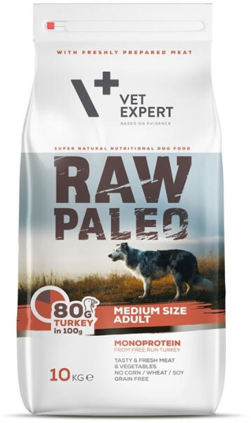 Gyártó: VetExpert Modell: Raw Paleo Medium size Adult 10 kg Leírás: Gabonamentes, teljes értékű eledel felnőtt, közepes fajtájú, 1 évesnél idősebb kutyák számára. 100 g eledelben legfeljebb 80 g kiváló minőségű hús található, amely a kutyák számára a legjobban emészthető. A friss alapanyagok magas aránya növeli az étel ízletességét és aromáját. A recept a kut