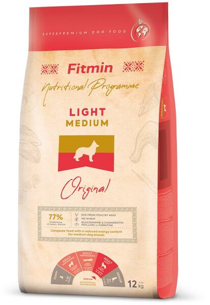 Szuper prémium minőségű, energiacsökkentett teljes értékű eledel felnőtt, közepes fajtájú kutyák számára. Anyagcsere-energia: 3520 kcal/kg, 14,73 MJ/kg. A Fitmin dog Medium Light kifejezetten a túlsúllyal küzdő, közepes fajtájú kutyák számára készült eledel. Nem túl aktívak, mert a fizikai kondíciójuk alacsonyabb, vagy egyszerűen csak szeretnek lustálkodni. Emiatt