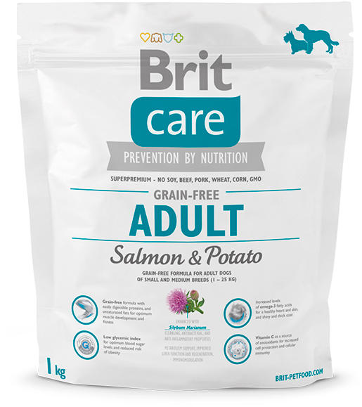 Termék részletekBrit Care Dog Grain-free Salmon Adult 1 kg Gabona- és gluténmentes táp felnőtt kutyáknak lazaccal A Brit Care Dog Grain-free Salmon Adult 1 kg egy kiváló minőségű, gabonamentes kutyatáp, amely lazaccal és burgonyával készült, és kis- és közepes testű (1-25 kg) felnőtt kutyák számára ideális. Teljes értékű kutyatáp, amely minden szükséges tápanyagot biztosít kutyája