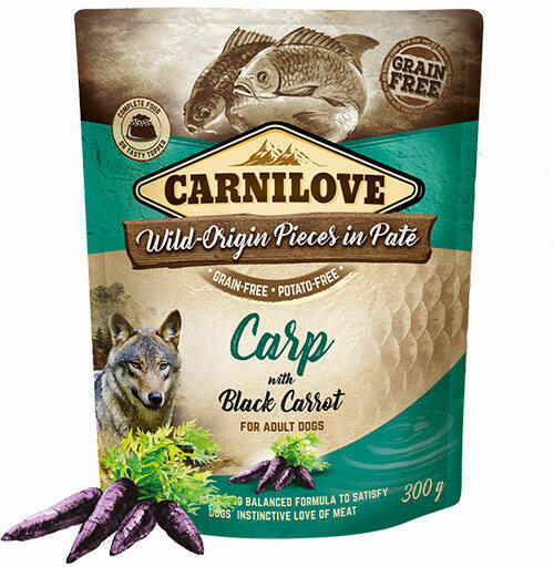 Termék részletekCarnilove Dog Tasakos Paté - Ponty Fekete Répával 300g A Carnilove Dog Tasakos Paté Carp with Black Carrot egy gabona- és burgonyamentes, teljes értékű eledel felnőtt kutyák számára, ponttyal és fekete répával készült. Ez az ínycsiklandó és tápláló eledel kutyájának természetes összetevők figyelembevételével biztosítja a szükséges tápanyagokat. Összetétel: 85% h