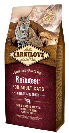 Carnilove Cat Adult Reindeer Energy & Outdoor- Rénszarvas Hússal 6Kg Összetétel: szarvas húsliszt (28%), vaddisznó húsliszt (28%), sárgaborsó (18%), csirkezsír (tokoferolokkal tartósítva, 13%), csirkemáj (4%), tápiókakeményítő (2%), lazacolaj (2%), alma (1%), sárgarépa (1%), lenmag (1%), csicseriborsó (1%), hidrolizált rákhéj (glükozamin forrás, 0,026%), porc kivonat