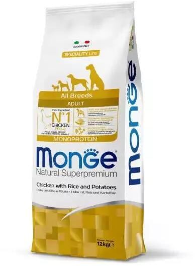 Monge Dog Speciality Line Monoprotein Adult - Chicken, Rice, PotatoTeljes értékű szárazeledel felnőtt kutyák számára csirkehússal, rizzsel és burgonyával. A kiváló minőségű alapanyagoknak és az olasz kutatómunkának köszönhetően egészséges táplálkozást biztosít kutyájának. A fő összetevője a csirke, ami könnyen emészthető és a hozzáadott friss húsnak köszönh