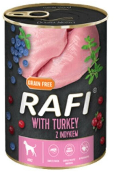 Dolina Noteci Rafi pulykával 400g - Leírás Teljes értékű nedves eledel minden fajta felnőtt kutyának - pulykával. A pulykahús és a nyersanyagok - amellett, hogy lizinben és metioninban gazdag, teljes értékű fehérjét tartalmaznak - értékes, többszörösen telítetlen zsírsavak forrása, különösen az n-6 zsírsavak családjából, amelyek jótékony hatással vannak a bőrre