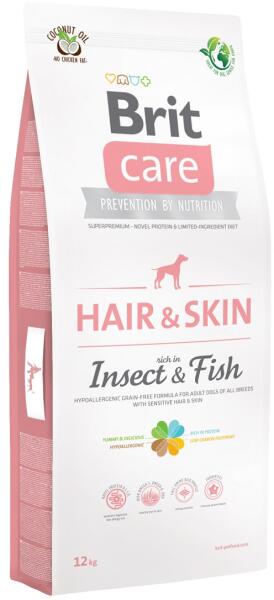 A Brit Care Grain-free Adult Hair&Skin Insect&Fish egy teljes értékű, hipoallergén szuperprémium száraztáp felnőtt kutyák számára. Kifejezetten érzékeny bőrű és szőrzetű kutyusoknak kifejlesztett ízletes száraztáp. Hipoallergén receptúra alapján készült, így ideális ételintoleranciával küzdő kutyusok számára is. A táp fehérjeforrása rovarok és fehérha
