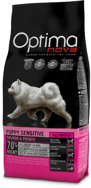 Az Optimanova Pup py Sensitive Salmon & Potato egy ízletes, teljes értékű lazacos burgonyás száraztáp kölyök kutyák számára. Kifejezetten érzékeny gyomrú kölyök kutyák számára kifejlesztett eledel. Kiválóan emészthető tápanyagok biztosítják a maximális felszívódást, így serkentve a kutyusok bélműködését és emésztését. Ínycsiklandó lazacos-burgonyás