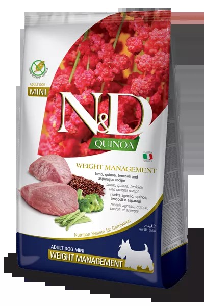N&D Quinoa Weight Management – Bárány, quinoa, brokkoli és spárga WEIGHT MANAGEMENT – Bárány, quinoa, brokkoli és spárga. Teljes értékű, gabonamentes eledel közepes és nagy testű felnőtt kutyák részére. Az N&D Quinoa Weight Management egy tudományosan összeállított diétás eledel, amelyet a túlzott testtömeg csökkentésének támogatására fejlesztettek ki. A recept