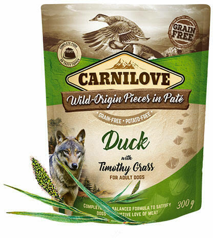 Carnilove Dog Tasakos Paté - Kacsa Mezei Komócsinnal 300g A Carnilove Dog Adult Tasakos Paté Duck with Timothy Grass egy gabona- és burgonyamentes, teljes értékű eledel felnőtt kutyák számára, kacsahússal és mezei komócsinnal. Ez a finom és tápláló eledel kutyája számára biztosítja a szükséges tápanyagokat, miközben természetes, gondosan válogatott összetevőket tartal