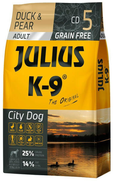 A Julius-K9 Grain Free City Dog Adult Duck & Pear gabonamentes felnőtt kutyatáp fő összetevője a kacsahús, amely egy kiváló, teljes értékű, kiegyensúlyozott aminosav profilú állati eredetű fehérjeforrás. Mivel a kacsahús emésztése során az állat tápcsatornájában nem alakulnak ki az allergiás reakciókért felelős antigén-antitest komplexek, ezért csak nagyon ritká