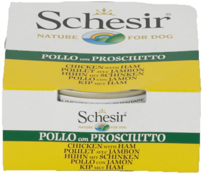 Kiegészítő nedvestáp csirkehússal és sonkával aszpikban, felnőtt kutyák számára fajtától függetlenül. a Schesir konzerveket az egész húsdarabok nagyszerű ízvilága és aromája jellemzi, az eledel csontok, bőr és belsőségek felhasználása nélkül készült a Schesir európai márka immáron 30 éve van jelen a piacon és 100%-ban természetes alapanyagokat használ nagysz