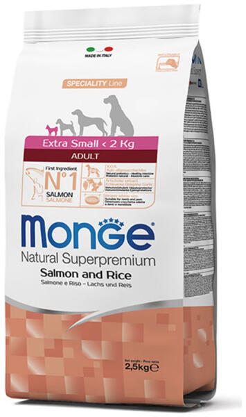 Kibbles Monge Natural Superpremium speciális vonal Extra kis lazac és rizs teljes táplálkozás extra kis méretű felnőtt kutyák számára. Ők garantálják a kutyád jólétét nagyon jó minőségű tápanyaguknak köszönhetően, amelyek a Made in Italy kutatás eredménye. Az egyetlen fehérje garanciával nagyon ízletes termékek: csak egyfajta hús. A fő összetevő a lazac, és XOS