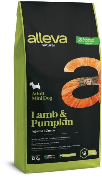 Alleva Natural természetes eledel alacsony gabona tartalommal, bárányhússal és sütőtökkel, kis felnőtt kutyák számára. a sütőtök, az inulin, a FOS, a MOS rostforrások, segítik a bélmikroflóra megfelelő működését monoprotein eledel - egyféle állati eredetű fehérjeforrást tartalmaz a nagy mennyiségű Omega-3 segít megőrizni a bőr egészségét a hozzáadott glükoza