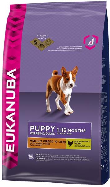 Eukanuba Puppy Medium Breed kiváló minőségű granulátum, teljes értékű kiegyensúlyozott eledel speciálisan közepes méretű kölyköknek kifejlesztve 10 kg-tól 25 kg-ig, 1-12 hónapos kor között. Az eledelben magas az energia tartalom, aminek köszönhető, hogy alkalmas terhes és szoptató szukáknak. Nem tartalmaz tartósítószereket, aromákat és mesterséges színezéket sem.