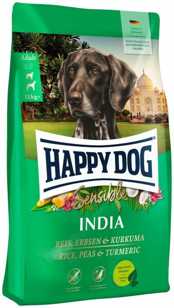 A Happy Dog Supreme India egy ízletes teljes értékű vegetáriánus eledel felnőtt kutyák számára. Ideális választás étel-intoleranciás, vagy érzékeny gyomrú kutyusok számára. Könnyen emészthető rizset és finom borsót tartalmaz. Magas fehérje és rosttartalommal rendelkeznek. A kurkumával együtt támogatják a kutyák egészséges emésztését. A Supreme India eledelével