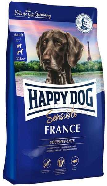 Happy Dog Supreme France, gabonamentes táp kacsával 100%-ban gabonamentes összetétel Állatorvosok ajánlásával Kizárólag ízletes kacsával* Jutalmazza kedvencét kulináris utazással A Happy Dog Sensible France egy szuper-prémium, teljes értékű eledel, ami ízletes kacsával és finom burgonyával alkot tökéletes kompozíciót. A kiegyensúlyozott recept mindennel ellátja négyl