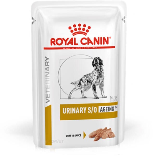ROYAL CANIN Urinary S/O Ageing 7+ 12x85g - Termékleírás Teljes értékű diétás eledel felnőtt, 7 évesnél idősebb kutyák számára. A struvitkövek feloldására és újbóli kialakulásuk megelőzésére lett kifejlesztve vizelet-savanyító tulajdonságainak, alacsony magnéziumtartalmának és csökkentett, de kiváló minőségű fehérjéinek köszönhetően. A kutyának folyamatosa