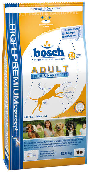 Bosch ADULT Fish & Potato teljes értékű kiegyensúlyozott eledel normál aktivitású felnőtt kutyáknak, melyeknek testsúlya nem több 40 kg-nál. hal és baromfihúsból készült krokettek halhúsból származó nagy mennyiségű fehérje kedvezően hat a bőrre és a szőr fényességére seg ít a sejtek és anyagcsere regenerálódásában k agylókivonattal az egészséges ízület