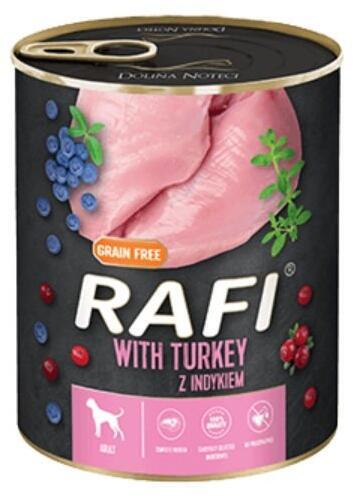Dolina Noteci Rafi pulykával 800g - Leírás Teljes értékű nedves eledel minden fajta felnőtt kutyának - pulykával. A pulykahús és a nyersanyagok - amellett, hogy lizinben és metioninban gazdag, teljes értékű fehérjét tartalmaznak - értékes, többszörösen telítetlen zsírsavak forrása, különösen az n-6 zsírsavak családjából, amelyek jótékony hatással vannak a bőrre